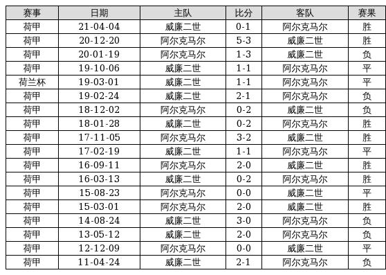 阿尔克马尔 VS 威廉二世两队近10年的交战次数为18场,阿尔克马尔7胜5平6负,赢球概率为38.9%,平局概率为27.8%,输球概率为33.3%。