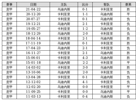 卡利亚里 VS 乌迪内斯两队近10年的交战次数为19场,卡利亚里6胜4平9负,赢球概率为31.6%,平局概率为21.1%,输球概率为47.4%。