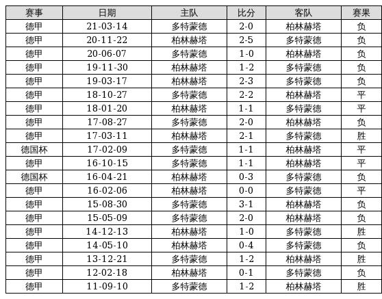 柏林赫塔 VS 多特蒙德两队近10年的交战次数为20场,柏林赫塔4胜5平11负,赢球概率为20%,平局概率为25%,输球概率为55%。
