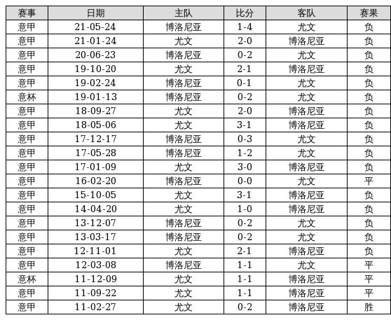 博洛尼亚 VS 尤文两队近10年的交战次数为21场,博洛尼亚1胜4平16负,赢球概率为4.8%,平局概率为19%,输球概率为76.2%。