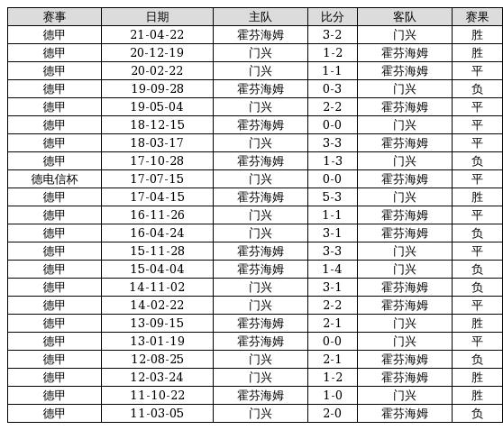 霍芬海姆 VS 门兴两队近10年的交战次数为22场,霍芬海姆6胜9平7负,赢球概率为27.3%,平局概率为40.9%,输球概率为31.8%。