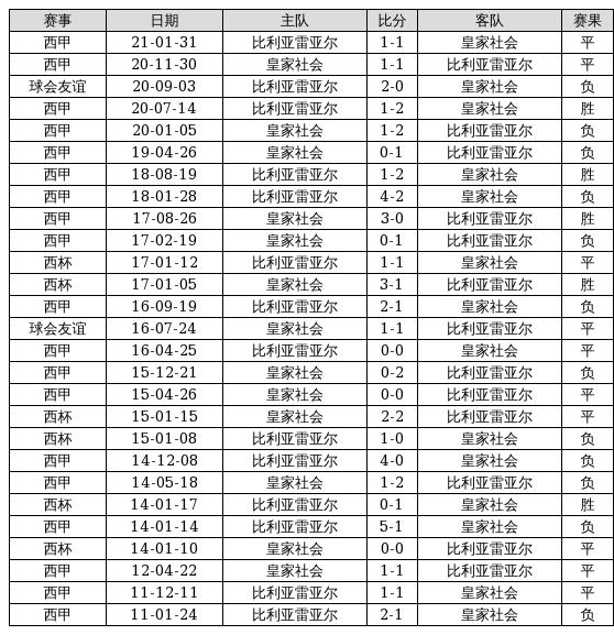 皇家社会 VS 比利亚雷亚尔两队近10年的交战次数为27场,皇家社会5胜10平12负,赢球概率为18.5%,平局概率为37%,输球概率为44.4%。