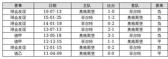 菲尔特 VS 奥格斯堡两队近10年的交战次数为8场,菲尔特2胜2平4负,赢球概率为25%,平局概率为25%,输球概率为50%。