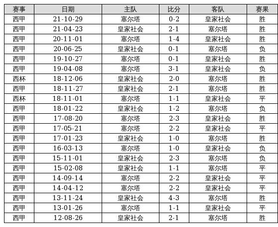 皇家社会 VS 塞尔塔两队近10年的交战次数为21场,皇家社会10胜6平5负,赢球概率为47.6%,平局概率为28.6%,输球概率为23.8%。