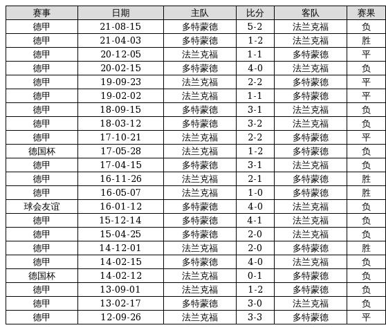 法兰克福 VS 多特蒙德两队近10年的交战次数为22场,法兰克福4胜5平13负,赢球概率为18.2%,平局概率为22.7%,输球概率为59.1%。