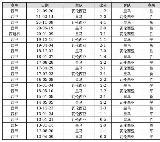 皇马 VS 瓦伦西亚两队近10年的交战次数为23场,皇马11胜8平4负,赢球概率为47.8%,平局概率为34.8%,输球概率为17.4%。