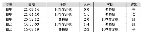 弗赖堡 VS 比勒菲尔德两队近10年的交战次数为5场,弗赖堡2胜2平1负,赢球概率为40%,平局概率为40%,输球概率为20%。