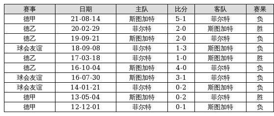 菲尔特 VS 斯图加特两队近10年的交战次数为10场,菲尔特3胜0平7负,赢球概率为30%,平局概率为0%,输球概率为70%。