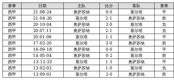 塞尔塔 VS 奥萨苏纳两队近10年的交战次数为11场,塞尔塔4胜4平3负,赢球概率为36.4%,平局概率为36.4%,输球概率为27.3%。