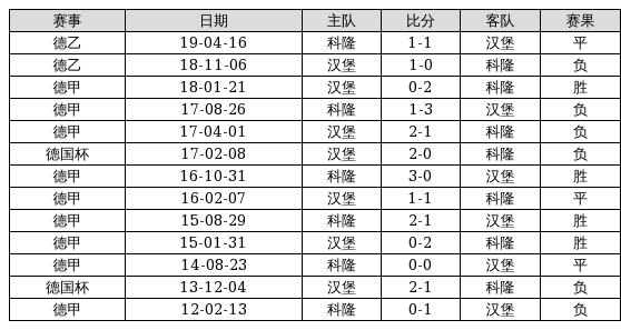科隆 VS 汉堡两队近10年的交战次数为13场,科隆4胜3平6负,赢球概率为30.8%,平局概率为23.1%,输球概率为46.2%。