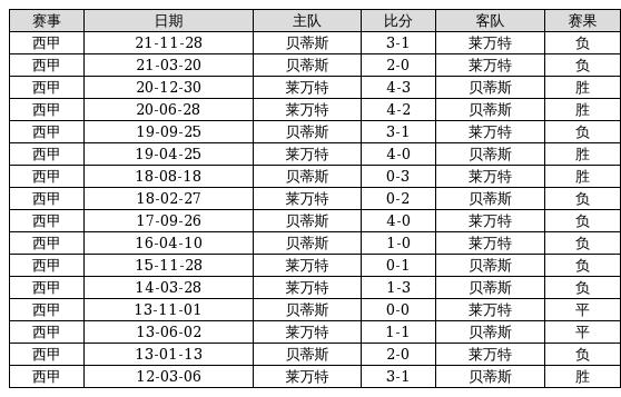 莱万特 VS 贝蒂斯两队近10年的交战次数为16场,莱万特5胜2平9负,赢球概率为31.3%,平局概率为12.5%,输球概率为56.3%。