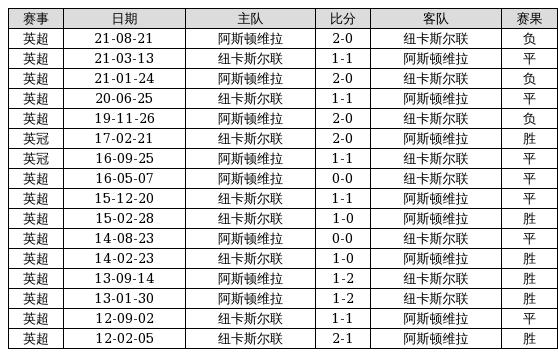 纽卡斯尔联 VS 阿斯顿维拉两队近10年的交战次数为16场,纽卡斯尔联6胜7平3负,赢球概率为37.5%,平局概率为43.8%,输球概率为18.8%。