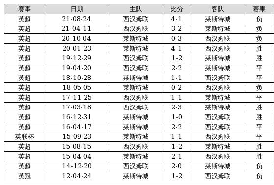 莱斯特城 VS 西汉姆联两队近10年的交战次数为17场,莱斯特城6胜5平6负,赢球概率为35.3%,平局概率为29.4%,输球概率为35.3%。