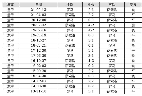 萨索洛 VS 罗马两队近10年的交战次数为17场,萨索洛1胜7平9负,赢球概率为5.9%,平局概率为41.2%,输球概率为52.9%。