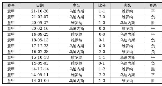 维罗纳 VS 乌迪内斯两队近10年的交战次数为13场,维罗纳3胜5平5负,赢球概率为23.1%,平局概率为38.5%,输球概率为38.5%。