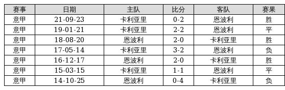 恩波利 VS 卡利亚里两队近10年的交战次数为7场,恩波利3胜2平2负,赢球概率为42.9%,平局概率为28.6%,输球概率为28.6%。