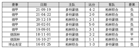 柏林联合 VS 多特蒙德两队近10年的交战次数为8场,柏林联合2胜2平4负,赢球概率为25%,平局概率为25%,输球概率为50%。