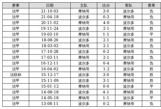 波尔多 VS 摩纳哥两队近10年的交战次数为17场,波尔多6胜3平8负,赢球概率为35.3%,平局概率为17.6%,输球概率为47.1%。