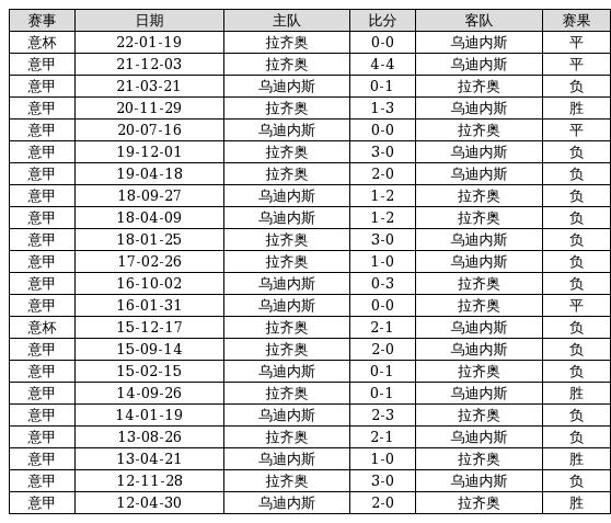 乌迪内斯 VS 拉齐奥两队近10年的交战次数为22场,乌迪内斯4胜4平14负,赢球概率为18.2%,平局概率为18.2%,输球概率为63.6%。