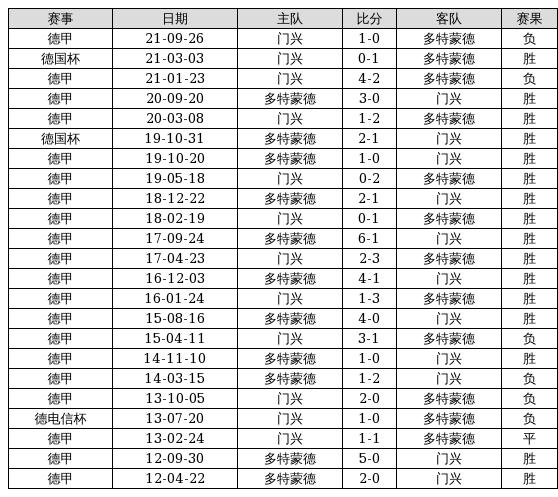 多特蒙德 VS 门兴两队近10年的交战次数为23场,多特蒙德16胜1平6负,赢球概率为69.6%,平局概率为4.3%,输球概率为26.1%。