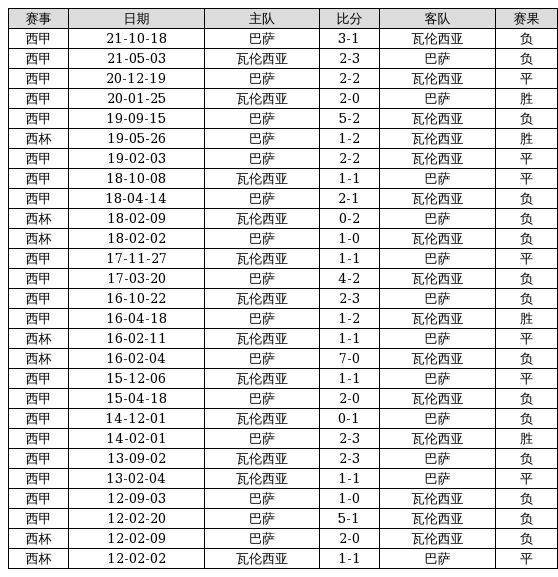 瓦伦西亚 VS 巴萨两队近10年的交战次数为27场,瓦伦西亚4胜8平15负,赢球概率为14.8%,平局概率为29.6%,输球概率为55.6%。