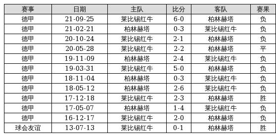 柏林赫塔 VS 莱比锡红牛两队近10年的交战次数为12场,柏林赫塔2胜1平9负,赢球概率为16.7%,平局概率为8.3%,输球概率为75%。