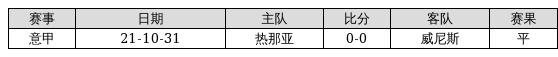 威尼斯 VS 热那亚两队近10年的交战次数为1场,威尼斯0胜1平0负,赢球概率为0%,平局概率为100%,输球概率为0%。