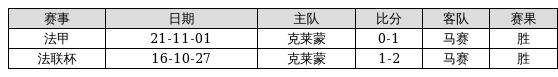 马赛 VS 克莱蒙两队近10年的交战次数为2场,马赛2胜0平0负,赢球概率为100%,平局概率为0%,输球概率为0%。