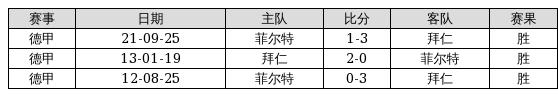 拜仁 VS 菲尔特两队近10年的交战次数为3场,拜仁3胜0平0负,赢球概率为100%,平局概率为0%,输球概率为0%。