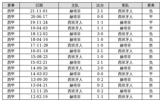 西班牙人 VS 赫塔菲两队近10年的交战次数为16场,西班牙人4胜5平7负,赢球概率为25%,平局概率为31.3%,输球概率为43.8%。