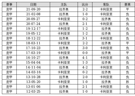 卡利亚里 VS 拉齐奥两队近10年的交战次数为18场,卡利亚里1胜3平14负,赢球概率为5.6%,平局概率为16.7%,输球概率为77.8%。