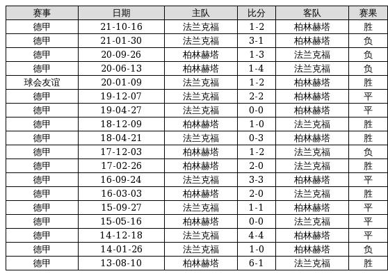柏林赫塔 VS 法兰克福两队近10年的交战次数为18场,柏林赫塔7胜6平5负,赢球概率为38.9%,平局概率为33.3%,输球概率为27.8%。