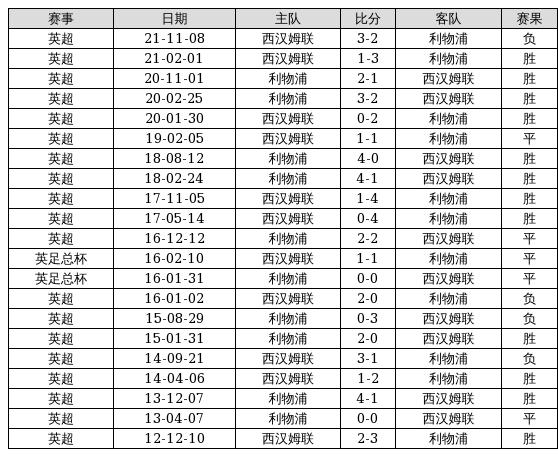 利物浦 VS 西汉姆联两队近10年的交战次数为21场,利物浦12胜5平4负,赢球概率为57.1%,平局概率为23.8%,输球概率为19%。