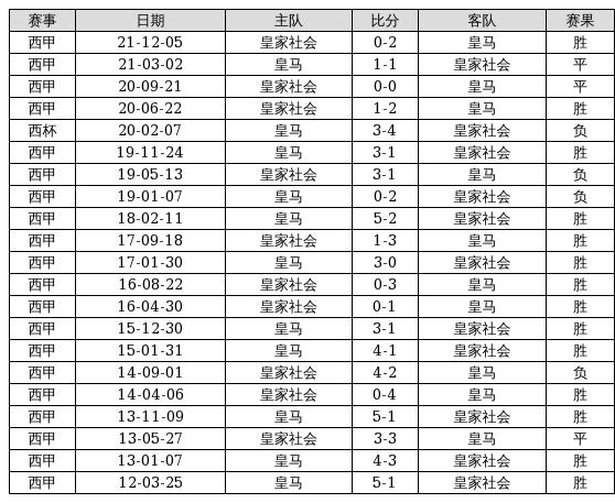 皇马 VS 皇家社会两队近10年的交战次数为21场,皇马14胜3平4负,赢球概率为66.7%,平局概率为14.3%,输球概率为19%。
