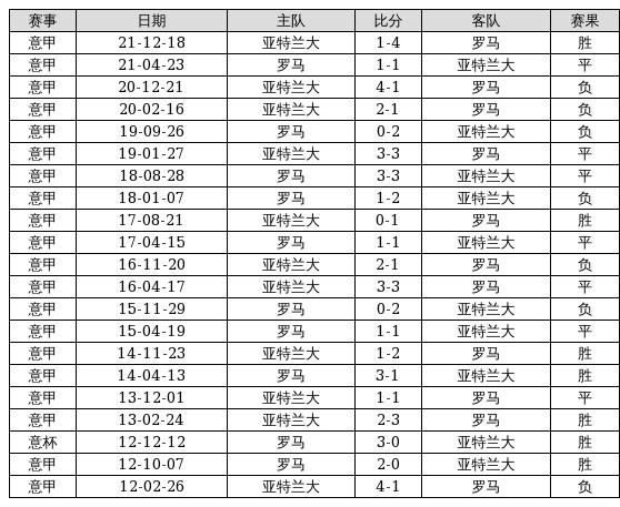 罗马 VS 亚特兰大两队近10年的交战次数为21场,罗马7胜7平7负,赢球概率为33.3%,平局概率为33.3%,输球概率为33.3%。