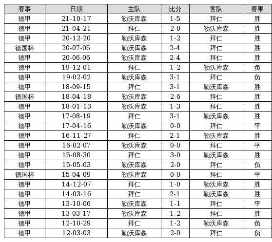 拜仁 VS 勒沃库森两队近10年的交战次数为23场,拜仁14胜4平5负,赢球概率为60.9%,平局概率为17.4%,输球概率为21.7%。