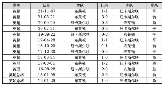 纽卡斯尔联 VS 布莱顿两队近10年的交战次数为13场,纽卡斯尔联2胜5平6负,赢球概率为15.4%,平局概率为38.5%,输球概率为46.2%。