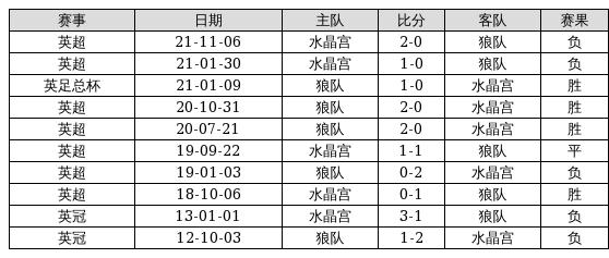 狼队 VS 水晶宫两队近10年的交战次数为10场,狼队4胜1平5负,赢球概率为40%,平局概率为10%,输球概率为50%。