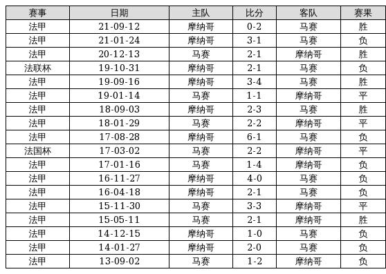 马赛 VS 摩纳哥两队近10年的交战次数为18场,马赛5胜4平9负,赢球概率为27.8%,平局概率为22.2%,输球概率为50%。