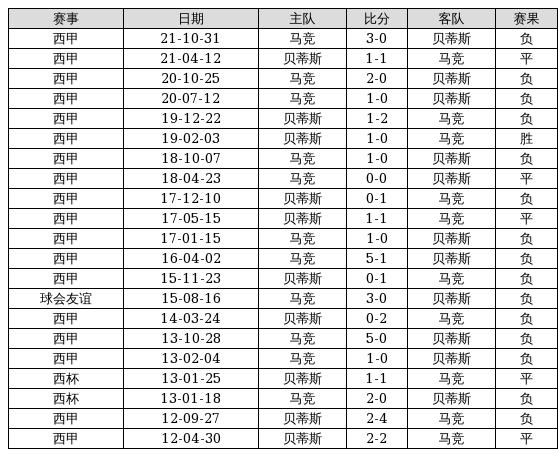 贝蒂斯 VS 马竞两队近10年的交战次数为21场,贝蒂斯1胜5平15负,赢球概率为4.8%,平局概率为23.8%,输球概率为71.4%。