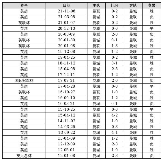 曼城 VS 曼联两队近10年的交战次数为26场,曼城12胜3平11负,赢球概率为46.2%,平局概率为11.5%,输球概率为42.3%。