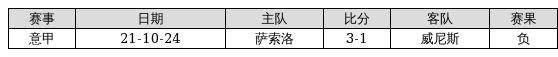威尼斯 VS 萨索洛两队近10年的交战次数为1场,威尼斯0胜0平1负,赢球概率为0%,平局概率为0%,输球概率为100%。