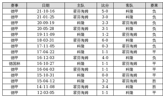 科隆 VS 霍芬海姆两队近10年的交战次数为15场,科隆2胜5平8负,赢球概率为13.3%,平局概率为33.3%,输球概率为53.3%。