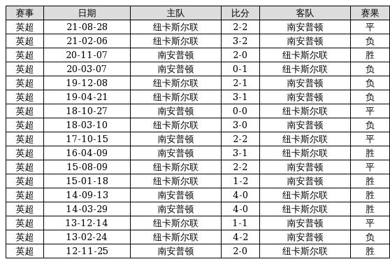 南安普顿 VS 纽卡斯尔联两队近10年的交战次数为17场,南安普顿6胜5平6负,赢球概率为35.3%,平局概率为29.4%,输球概率为35.3%。