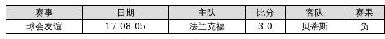 贝蒂斯 VS 法兰克福两队近10年的交战次数为1场,贝蒂斯0胜0平1负,赢球概率为0%,平局概率为0%,输球概率为100%。