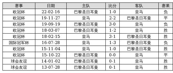 皇马 VS 巴黎圣日耳曼两队近10年的交战次数为10场,皇马5胜2平3负,赢球概率为50%,平局概率为20%,输球概率为30%。