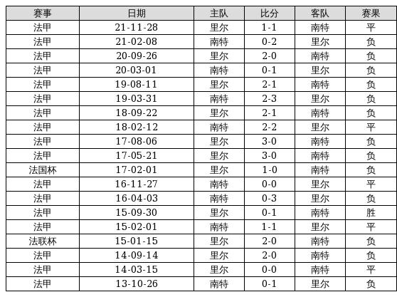 南特 VS 里尔两队近10年的交战次数为19场,南特1胜5平13负,赢球概率为5.3%,平局概率为26.3%,输球概率为68.4%。