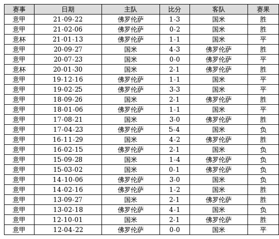 国米 VS 佛罗伦萨两队近10年的交战次数为22场,国米10胜6平6负,赢球概率为45.5%,平局概率为27.3%,输球概率为27.3%。