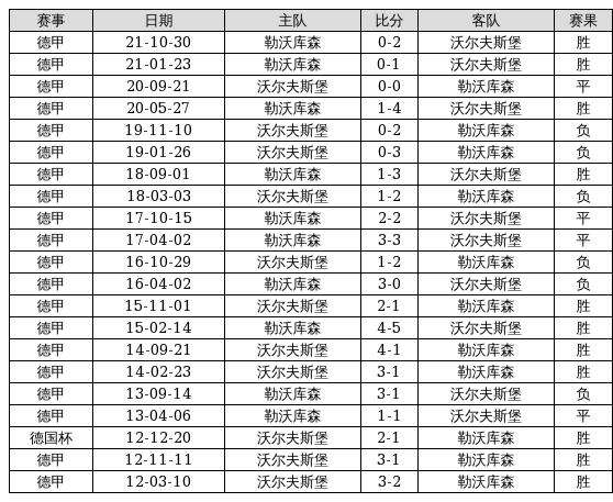 沃尔夫斯堡 VS 勒沃库森两队近10年的交战次数为21场,沃尔夫斯堡11胜4平6负,赢球概率为52.4%,平局概率为19%,输球概率为28.6%。