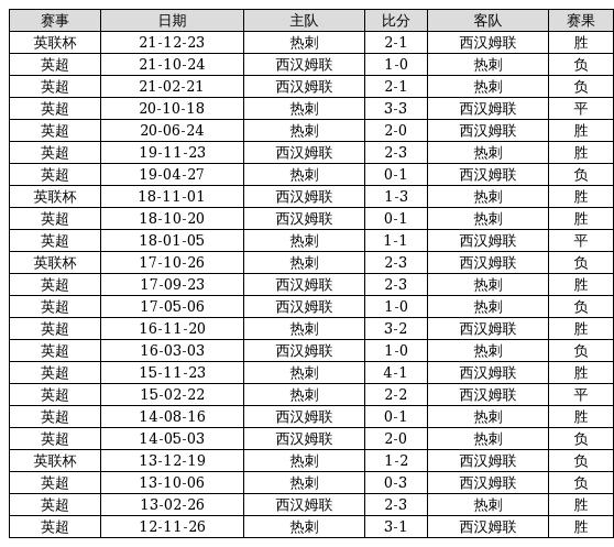 热刺 VS 西汉姆联两队近10年的交战次数为23场,热刺11胜3平9负,赢球概率为47.8%,平局概率为13%,输球概率为39.1%。